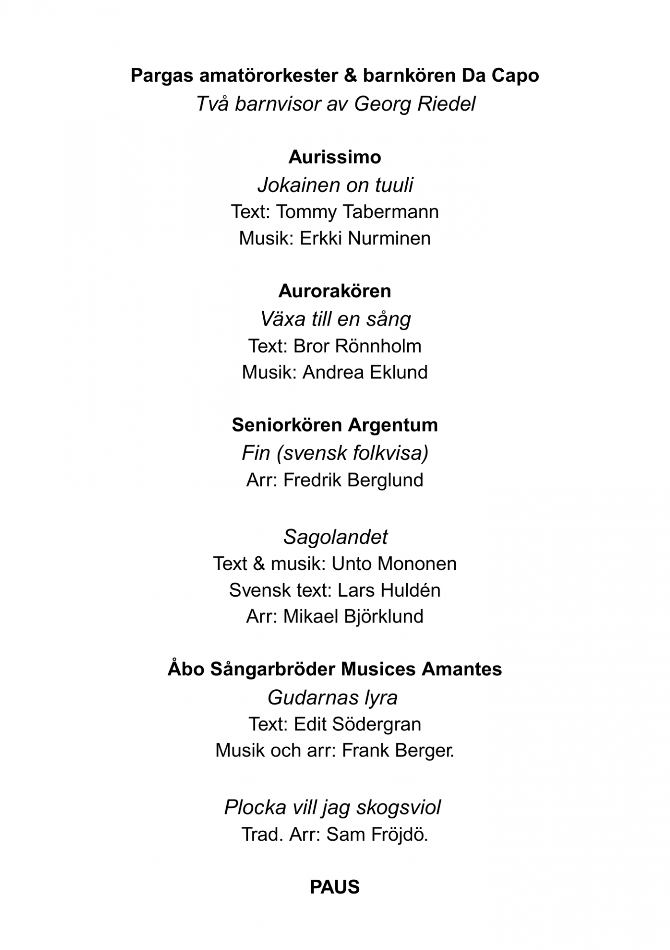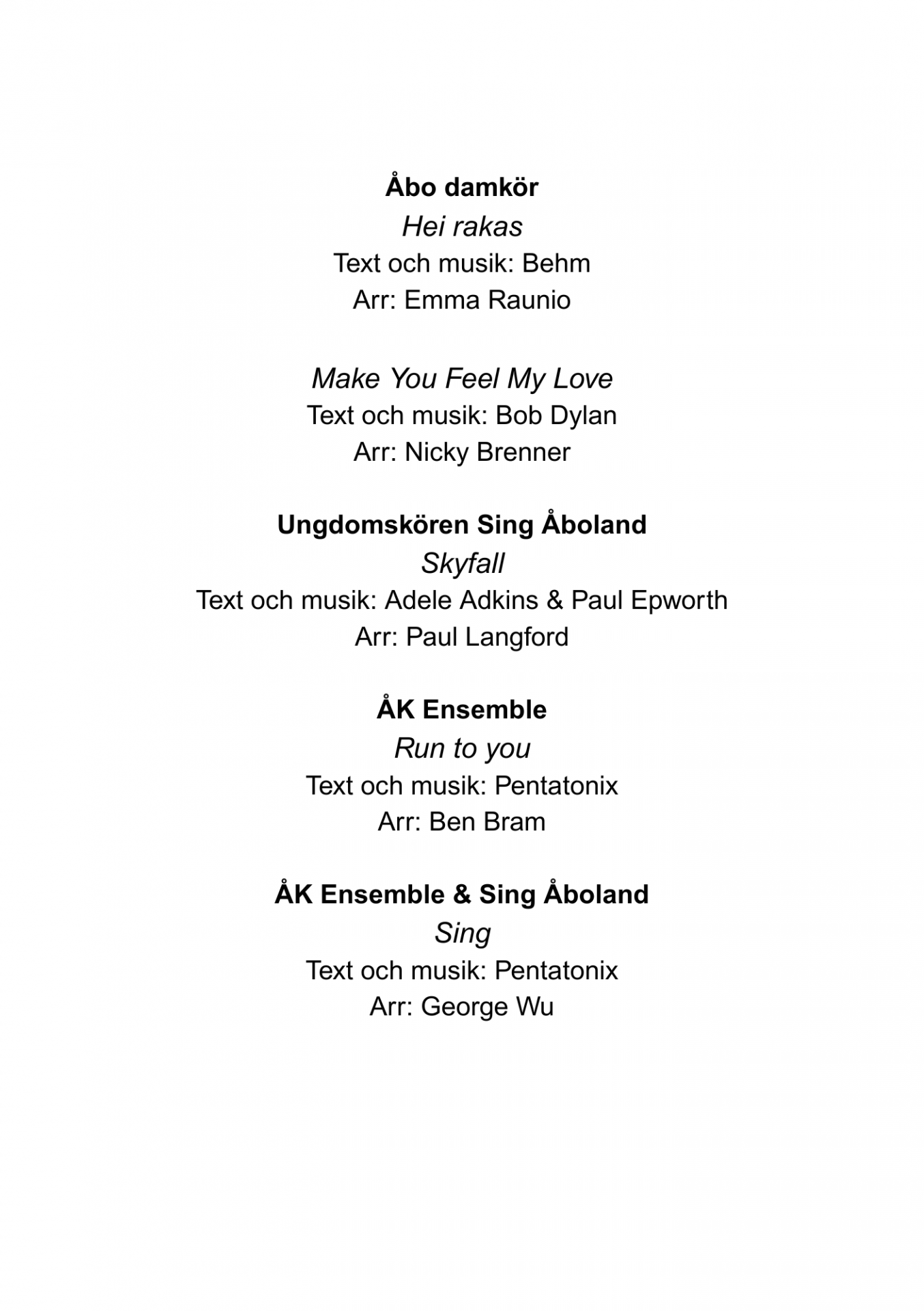 Övriga samövningar ordnas 22.11 och 24.1. Konserten blir i Sigynsalen 7.2.2026.