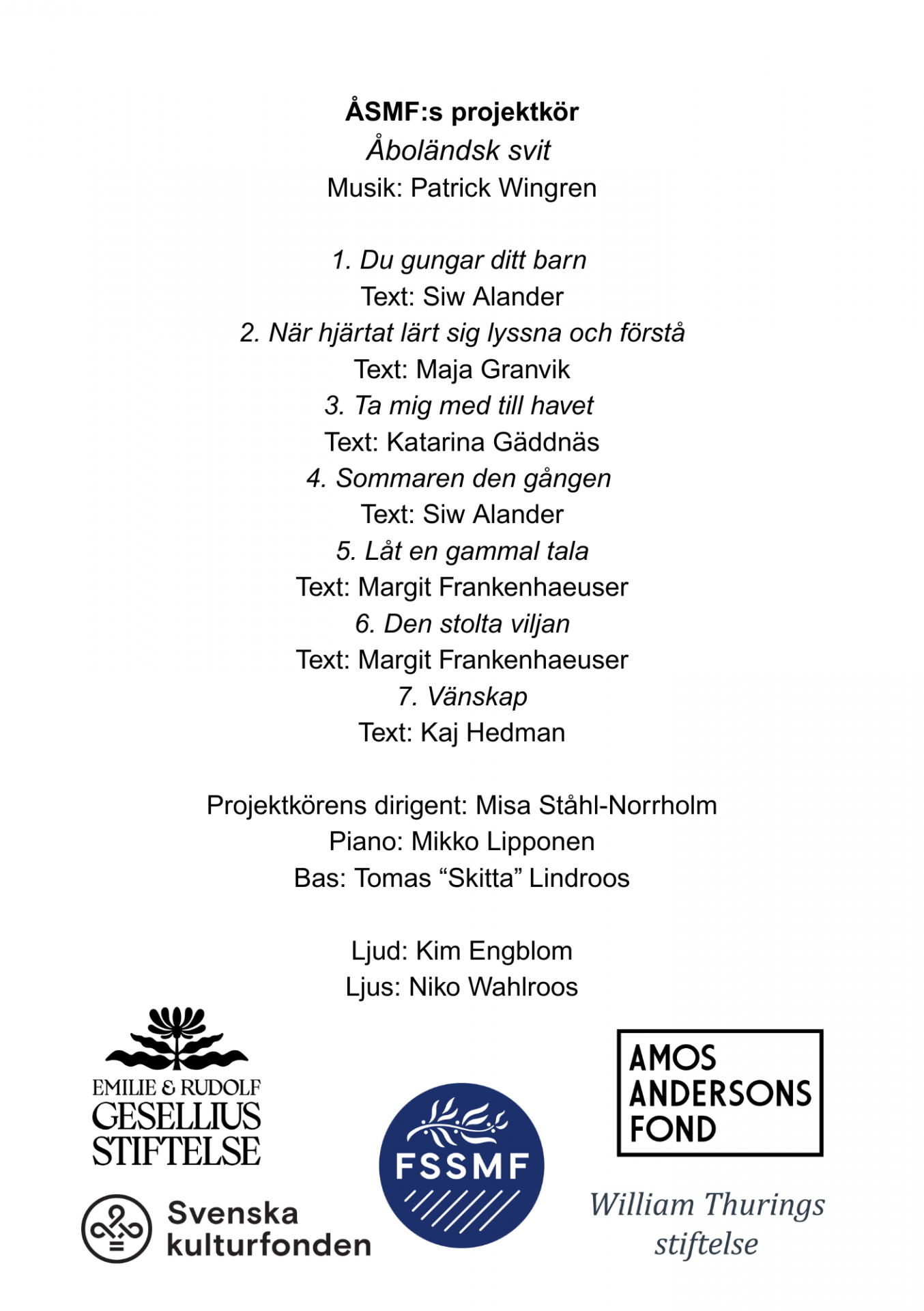 Nu börjar förberedelserna inför ÅSMFs gemensamma konsert i februari. Projektkören som tillsammans ska sjunga Patrick Wingrens Åboländska svit har sin första samövning lördagen den 11.10 kl. 10–15. Vi tar en paus för lunch kl. 12–13.